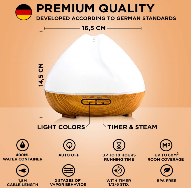 Stilingo dizaino, minimalistinio stiliaus difuzorius. Net 400 ml tūrio – puikiai tiek mažesnėms, tiek didesnėms patalpoms Puikiai tiks aromaterapijos meditacijai Išskirtinis dizainas 7 spalvų reguliuojamo intensyvumo LED šviesa – maloni…